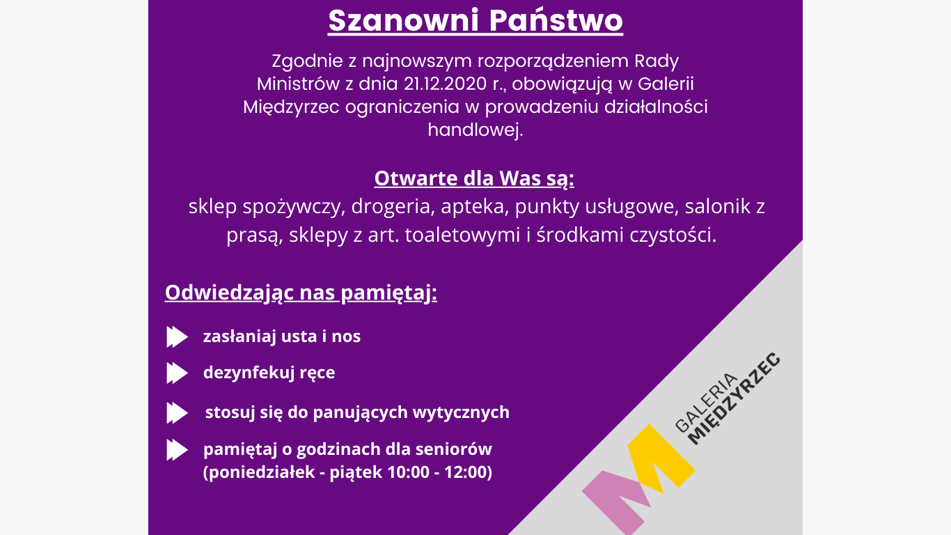 Przypominamy, że zgodnie z najnowszym rozporządzeniem Rady Ministrów w Galerii Międzyrzec obowiązują ograniczenia w prowadzeniu działalności handlowej od dnia 28 grudnia br.